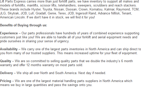 All our lift truck parts are obtainable at the best prices. Give us a phone call today if you have an interest in getting a price quote for our parts or attachments. Our number is:
